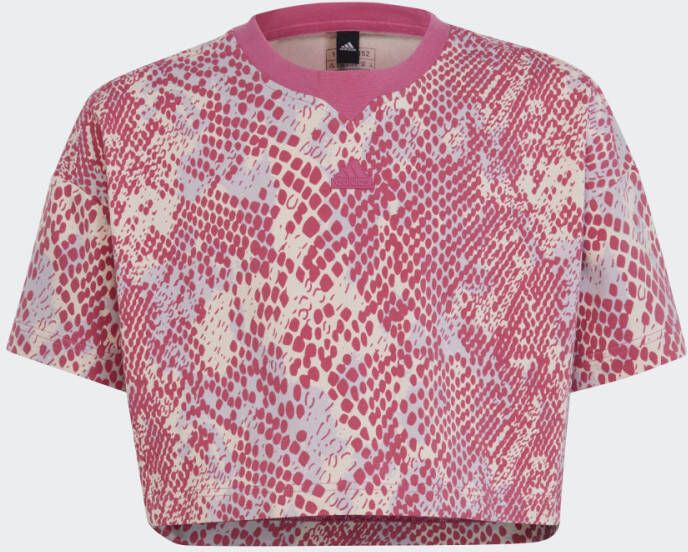 Maak een veelkleurig statement. De levendige dierenprint maakt van dit zachte, kortere junior adidas T-shirt een fashion-openbaring. De adidas Badge of Sport is op de borst gestreken, en het gladde katoen houdt je comfortabel terwijl je alles uit je look haalt.Onze katoenen kleding ondersteunt duurzamere katoenproductie.
